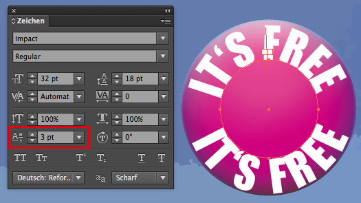 5. Um den Text näher an die Pfadlinie zu stellen gehen Sie zu MENU > FENSTER > SCHRIFT > ZEICHEN und ändern den Grundlinienversatz nach Wunsch.