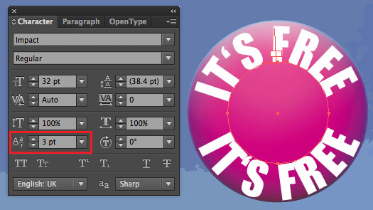 5. To move the text closer to the path, go to WINDOW > TYPE > CHARACTER and set the Baseline Shift accordingly.