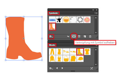 Wie ich Symbole in Adobe Illustrator benutze: Ich gehe unter MENÜ > FENSTER > SYMBOLE und wähle ein Mode-Symbol welche man in den Symbol-Bibliotheken finden kann. Sehr wichtig: auf das icon klicken “Verknüpfung mit Symbol aufheben”.