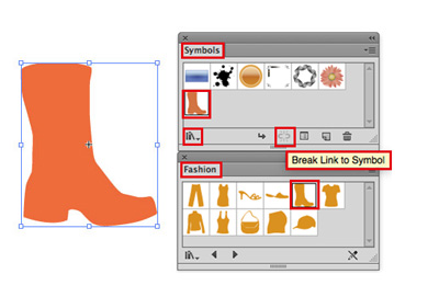 How I use Symbols in Adobe Illustrator: I go under MENU > WINDOW > SYMBOLS and choose a Fashion Symbol which you can find in the Symbol-Library. Very important: to click on the icon “Break Link to Symbol”.