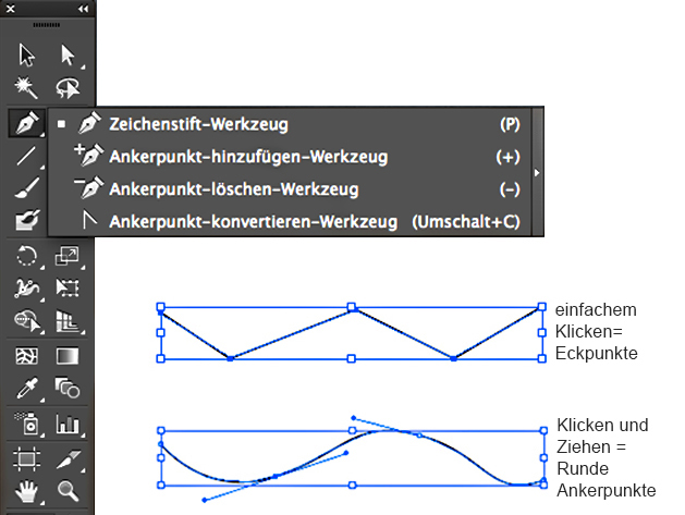Dann nehme ich das Direkt-Auswahl-Werkzeug (Weisser Pfeil) und ziehe an den Punkten bis ich mein gewünschtes Resultat erreicht habe!
