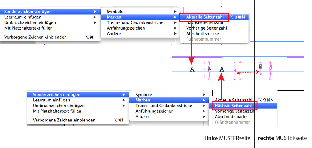 3. Für die linke Seitenzahl gehe ich zu Schrift > Sonderzeichen einfügen > Marken > Aktuelle Seitenzahl.