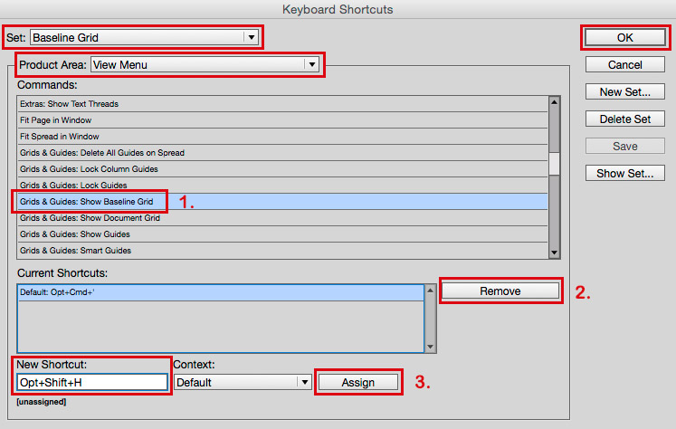 In our case I’ve selected on my Mac for Show/Hide Baseline Grid: ALT (Option) + SHIFT + H