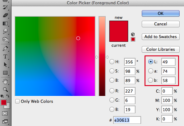 Open your Color Picker by double-clicking the Foreground Color on the Tool bar. There you can see the HSB colors (Hue, Brightness, Saturation), the RGB colors (for monitors, such as web) incl. the HEX code, the CMYK colors (for the printing process) and the LAB colors.