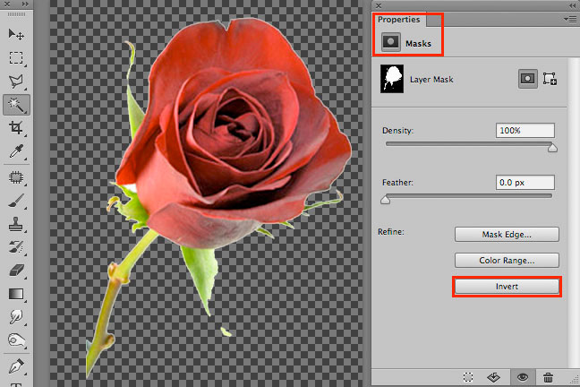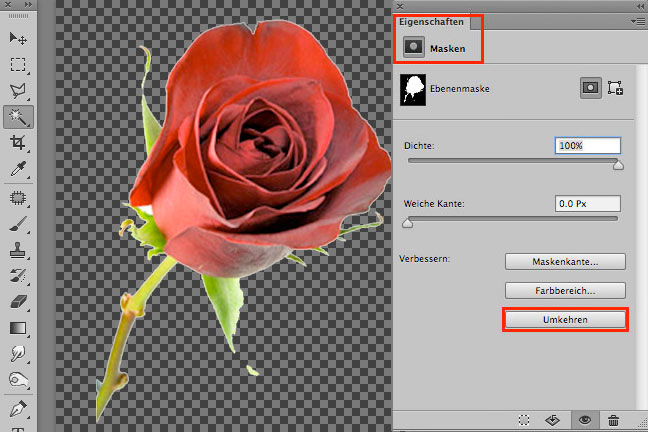 In manchen Fällen müssen Sie Ihre Auswahl umkehren: klicken Sie auf die Ebenenmaske, damit öffnen sich die Eigenschaften. Dort wählen Sie die Box Umkehren.