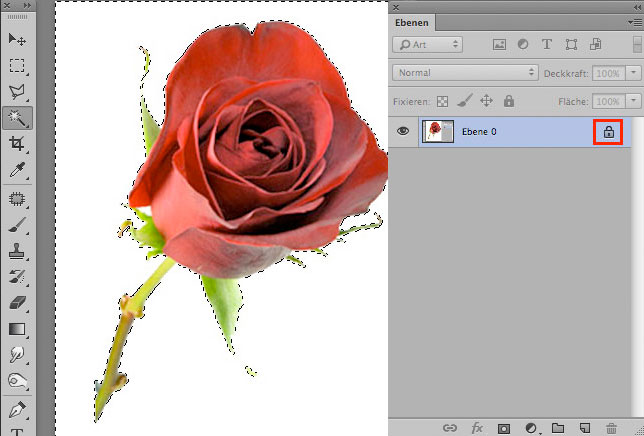 Öffnen Sie Ihr Photoshop Bild und doppelklicken Sie auf das Schloss, damit wird es Ebene 0.