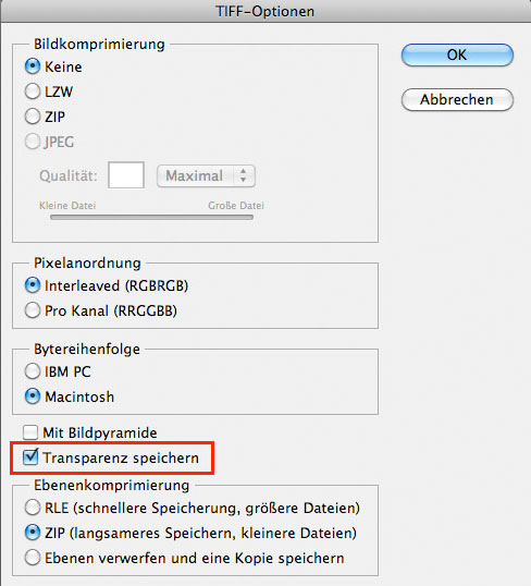 Jetzt kommt der wichtigste Punkt: Sichern Sie ihr Tiff mit allen Ebenen und bei den Tiff-Optionen klicken Sie auf die Box Transparenz speichern.