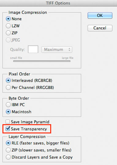 Now comes the crucial step: Save the file as a Tiff with all the layers and in the Tiff Options window click on the box save Save Transparency.