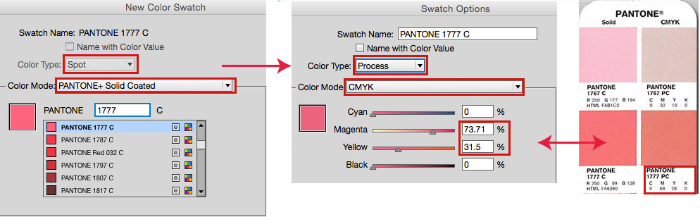In kürze: mein Pantone Bridge Fächer zeigt den Breakdown von meiner Pantone Farbe 1777C als: C:0 / M:68 / Y: 28 / K: 0 > hingegen mein Adobe InDesign, Illustrator und Photoshop zeigen: C:0 / M: 73 / Y: 31 / K:0 – wie sie beim Bild oben sehen können.