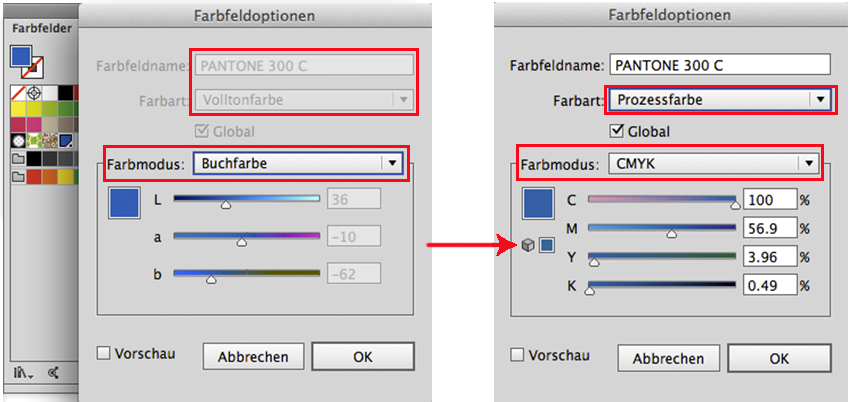 Waren Sie jemals verärgert als Sie Ihre Pantone Farbe in eine CMYK Farbe umwandeln wollten? Vermutlich hatten Sie Ihren Pantone Color Bridge Fächer offen, suchten den CMYK Breakdown und waren erstaunt, dass Ihr Pantone Bridge Fächer komplett andere Nummern aufzeigt als Ihre Adobe Programme? Öffnen Sie Ihre Farbfelder und Ihre Optionen damit Sie den Farbtyp und Farbmodus auf Prozess und CMYK ändern können. Siehe Bild unten!