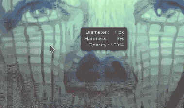 Bei Windows: Alt Taste + rechter Mausklick – klicken & ziehen nach links/rechts um den Pinsel zu verkleinern/vergrössern und nach oben/unten um die Härte zu reduzieren/verstärken.