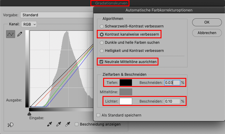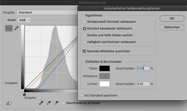 TIPP: Eine automatische Basiskorrektur bei “normalen Fotos” kann man mit den Gradationskurven einstellen. Unter Optionen folgende Koordinaten eingeben, mit OK bestätigen und das Resultat mit dem Original vergleichen.