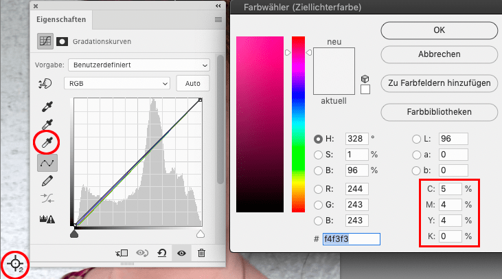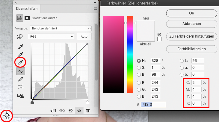 Im Gradationsfenster, doppelklick auf die Pipette für den Lichter-Bereich im CMYK 5,4,4,0, eingeben. Danach das Fenster (Farbwähler) schliessen.