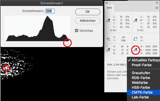 im Schwellenwert den Regler nach rechts schieben und die hellste Stelle finden: mit der SHIFT Taste aktiv in die hellste Stelle klicken, diese wird im Info-Bedienfeld mit einem 2. markiert: unter dem Pfeil werden die CMYK Werte umgerechtet. Wichtig: nach dem Herausfiltern der Tiefe und des Lichts auf ABRECHEN klicken!