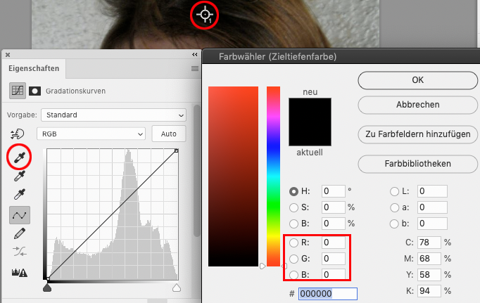 Im Gradationsfenster, doppelklick auf die Pipette für den Tiefen-Bereich im RGB 0, 0, 0, eingeben. Danach das Fenster (Farbwähler) schliessen.