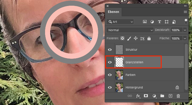 Um Glanzstellen zu reduzieren; eine neue Ebene unter der Struktur Ebene erstellen und z.B. mit “Glanzstellen” benennen. Mit einem Pinsel, Deckkraft ca. 20 bis 50% und einer 0% Härte die Glanzstellen sanft übermalen. Tipp: Mit der Alt-Taste aktiv erscheint das Pipetten-Werkzeug, womit man den Hautton aufnehmen und übertragen kann.