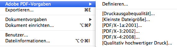 3. Gehen Sie unter DATEI > Adobe PDF Vorgaben > PDF/X-3, PDF/X-4