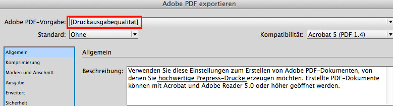 Mehr Info über die PDF Vorgaben bei ADOBE Help: PDF Vorgaben