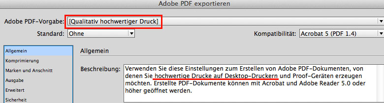 4. Gehen Sie unter DATEI > Adobe PDF Vorgaben > Qualitativ hochwertiger Druck.