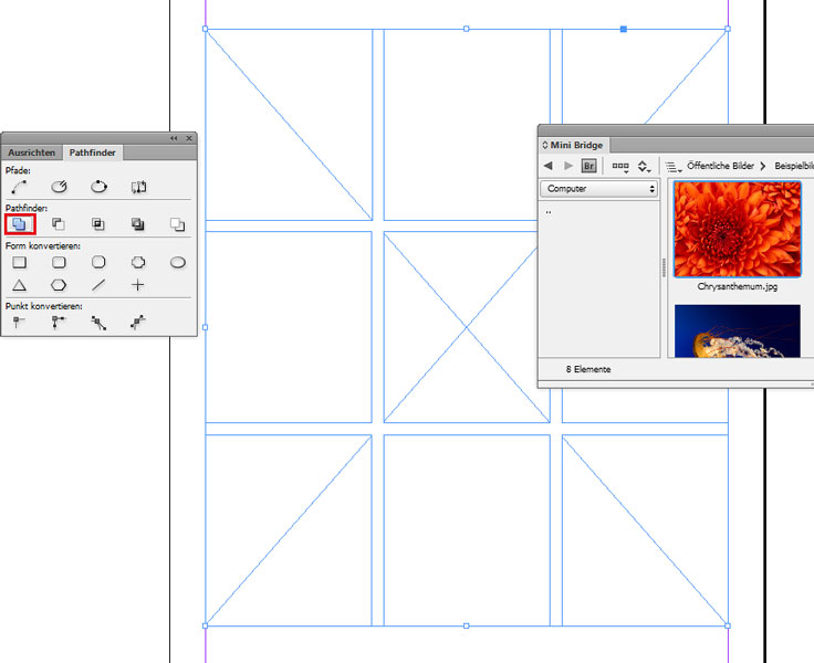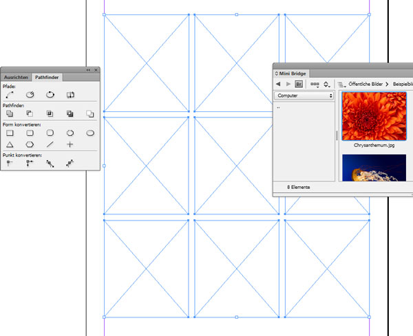 2. If possible open the MINI BRIDGE – then select all 9 squares at the same time using the Selection-Tool and open the PATHFINDER under WINDOW > OBJECT & LAYOUT.